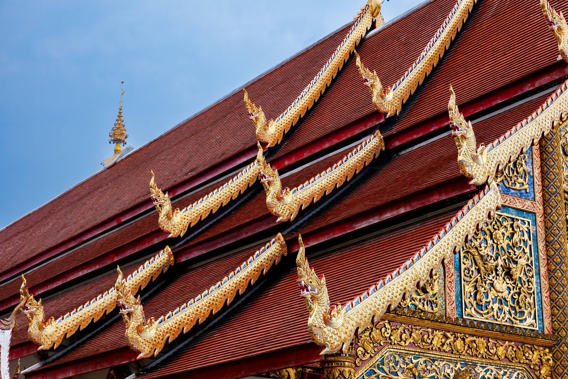 Tijdens een bezoek aan de tempels Wat Phra Singh of Wat Chedi Luang, beiden opgenomen in de reisroute, wordt meteen duidelijk wat Lanna zo bijzonder maakt: lage gebouwen in warme houttinten, verfijnde houtsnijwerken en de karakteristieke galae die de daken sieren. Ook de beeldhouwkunst heeft een heel eigen signatuur: Lanna-Boeddhabeelden zijn herkenbaar aan hun zachte, ronde vormen, een rustige gelaatsuitdrukking en vaak een sierlijke vlam op het hoofd als symbool van verlichting. Deze iconische stijl geeft de tempels en heiligdommen een heel eigen uitstraling die je nergens anders in Thailand zo sterk terugziet.