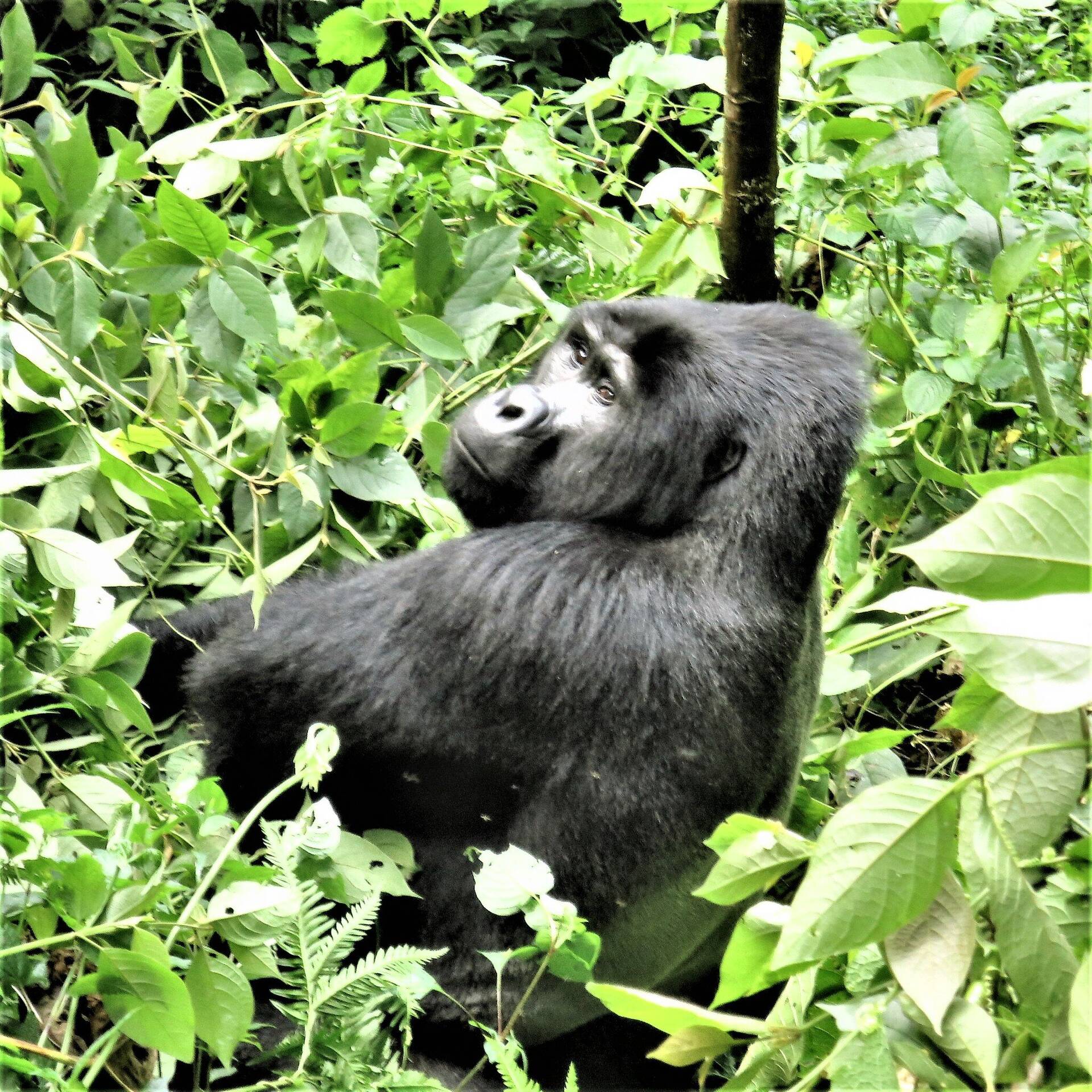 Vandaag is de dag dat we naar de berggorilla’s op zoek gaan in het Bwindi impenetrable National Park. En impenetrable of ondoordringbaar mag je letterlijk nemen. Het rangerstation ligt op een dikke anderhalf uur rijden en dus vertrekken we om 6h. het park grenst aan het Virunga park in Congo en samen telt het ongeveer een 1000–tal gorilla’s waarvan een 400 in Bwindi. 14 groepen heeft men gewoon gemaakt op menselijke aanwezigheid dichtbij. Ons gezelschap wordt weer gesplitst en samen met een dame uit Argentinië zijn wij met 7. Iedereen krijgt een drager, ik krijg een draagster, een lieve juffrouw die ik met plezier mijn rugzak overhandig. De familie die wij zoeken heet Mukiza naar de naam van de silverback. Een ranger gaat voorop, en er zijn nog eens extra twee gewapende rangers die ons vergezellen. Voor ons vertrekpunt moeten we een tiental minuten terug met de wagen. En dan starten we en al snel is duidelijk dat dit geen wandeling in het park is. We staan hier volgens mijn hoogtemeter op 2500m en we dalen snel af langs steile hellingen. In het beste geval is er een zichtbaar pad maar soms wordt er een pad gehakt door de dichte begroeiing. Iedereen heeft ook een wandelstaf meegekregen en die komt verdraaid goed van pas. Ik dank de hemel dat het niet geregend heeft en dat de hellingen er niet te glad bij liggen. En dan na een anderhalf uur staan we plots oog in oog met de trackers en scouts die onze familie hebben gelokaliseerd. Stokken, drinken en eten blijft achter, enkel fototoestel of filmapparaat mag mee. En dan zien we de eerste leden van de groep. Jong grut dat zich aan het malse groen en een vermolmde boomstam te goed doen. De silverback zit een beetje verder en gunt ons een halve blik. Scouts hakken overtollig groen weg zodat we beter zicht krijgen op de verschillende leden van de groep. In theorie hou je 7 m afstand, maar daar trekken de gorillas zich geen fluit van aan. Op de steile helling is het een beetje zoeken naar een goed evenwicht. Jonge dieren zeg maar de kinderen bekijken ons een beetje nieuwsgierig maar gaan dan gewoon door met rollebollen en spelen terwijl moeder en tantes, broers en zussen zich volproppen met het malse groen. We mogen een uur blijven en dat uurtje is snel voorbij.