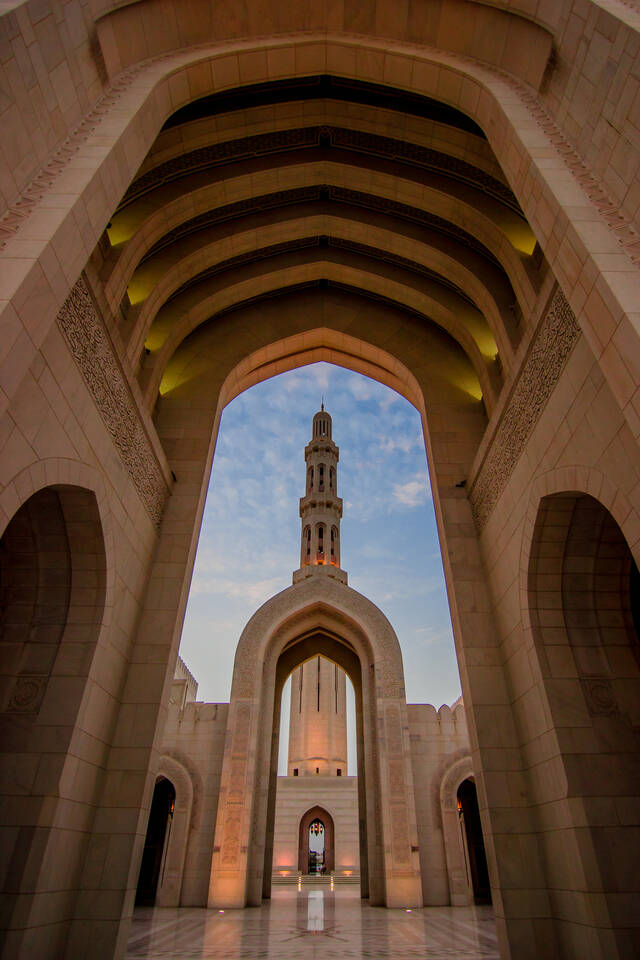 Wandel door de moderne marmeren Sultan Qaboos Moskee, een van de mooiste en grootste ter wereld waar marmer uit Italië, glas-in lood en een gigantische Swarovski kroonluchter het interieur sieren.